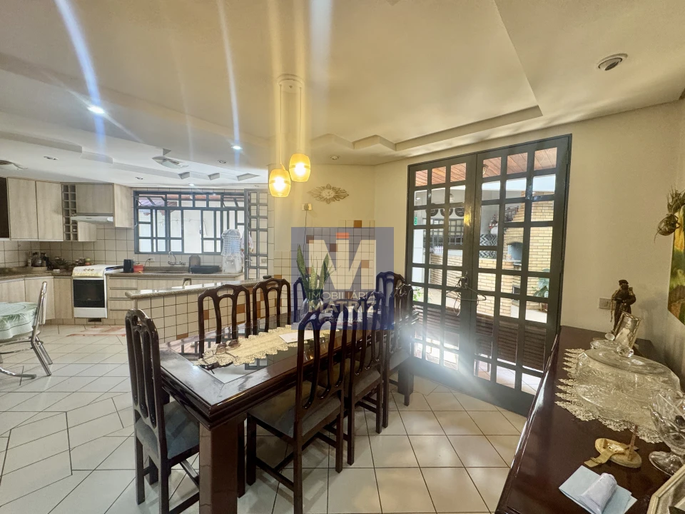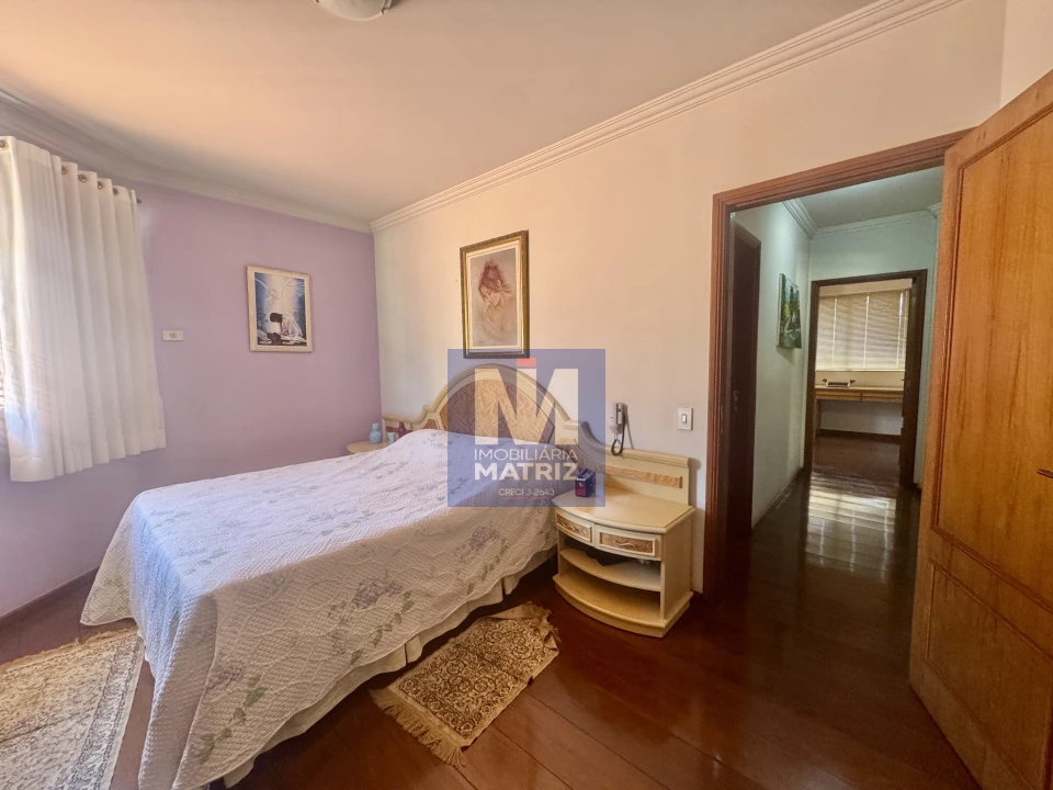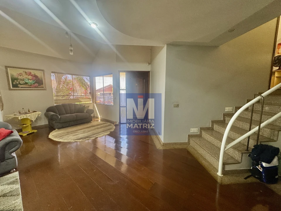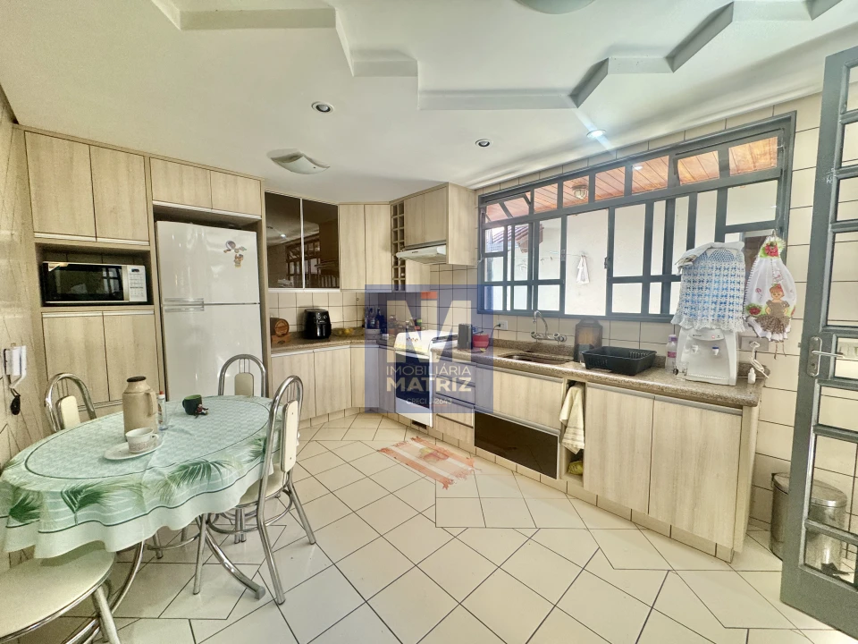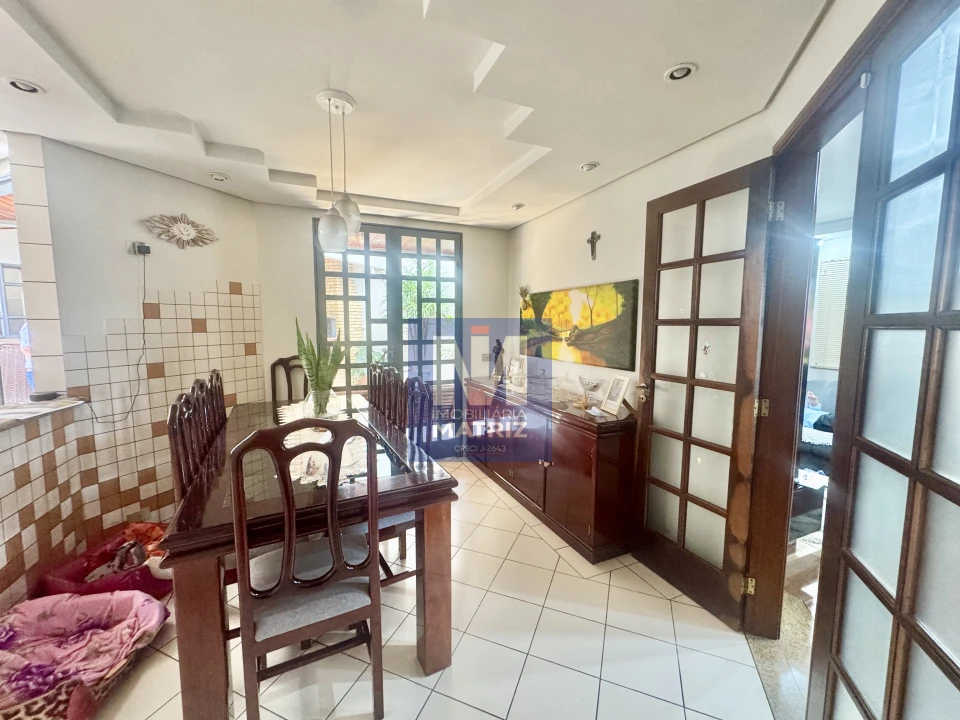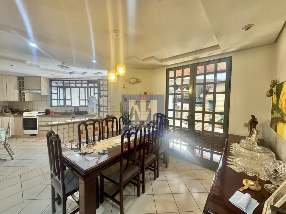 04 dormitórios sendo 01 suíte, sala de estar, sala TV, sala de jantar, cozinha planejada, 01 lavabo, banheiro social, piso cerâmico e assoalho de madeira, pé direito alto, área com churrasqueira, dependência com 01 dormitório, sala, cozinha, banheiro, área de serviço, garagem para 02 carros