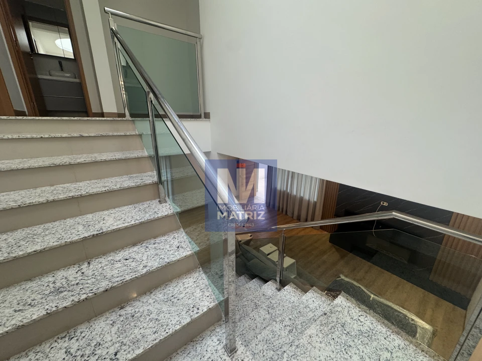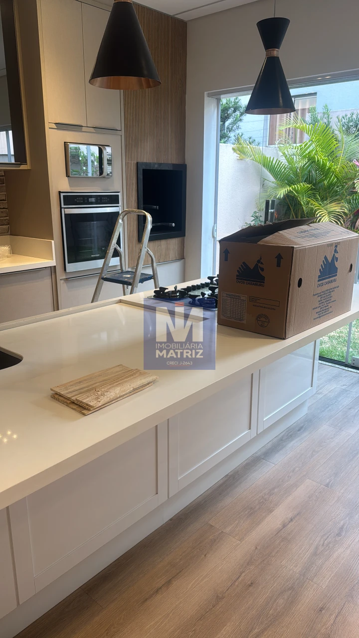 Piso inferior com sala de tv, sala de jantar e cozinha integradas, espaço gourmet, toda equipada em armários de excelente qualidade, eletros domésticos embutidos, churrasqueira, bancada com triturador na pia que vai direto para esgoto, Lavabo, banheiro social, área de serviço e garagem para 04 carros